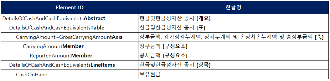 | 표 (Table) | XBRL 양식 작성을 위해 사용되는 요소 (Element)로, 주로 Abtract의 하위 Element로 사용된다. |